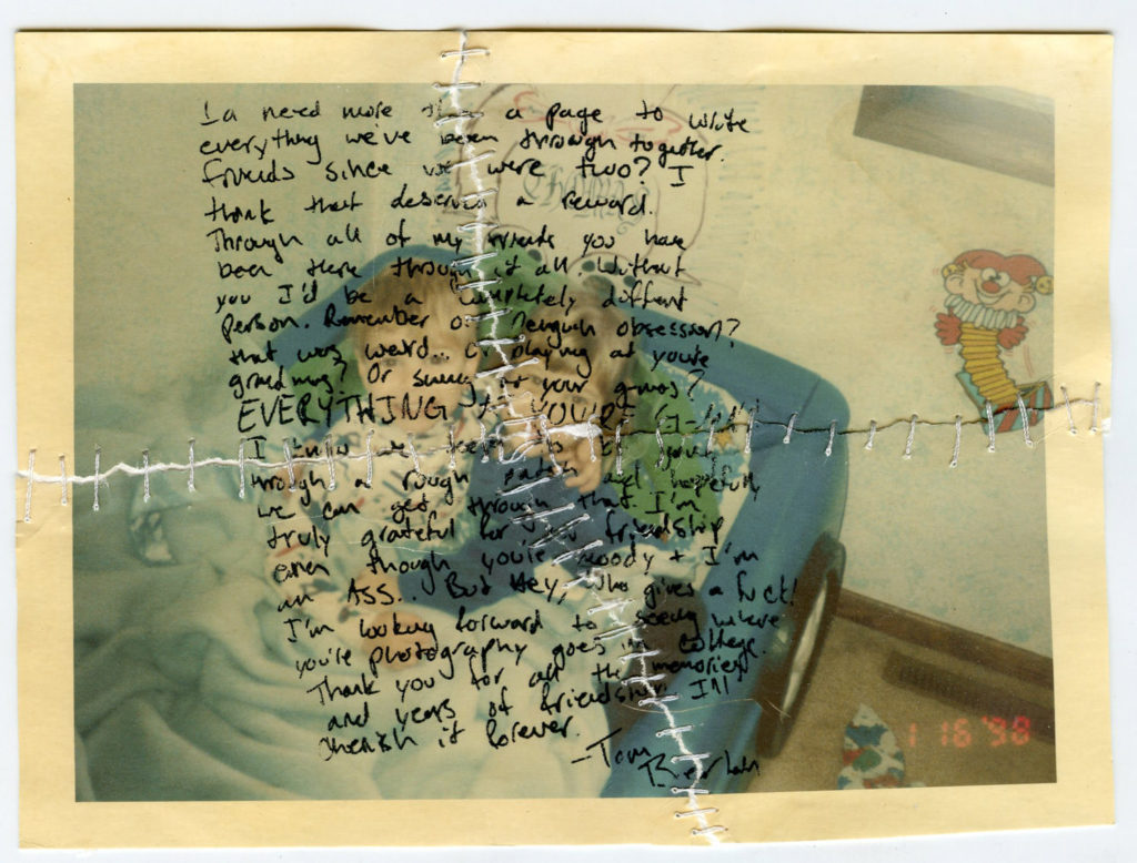 “For this assignment I wanted to depict the strength and endurance of friendship. I printed off an old picture of me and my friend Tom from when we were just little kids. We’ve been best friends ever since I can remember, and this is the oldest picture I have of the two of us. I stained the print to make it look more aged, and I ripped it up apart to represent the hard times that our friendship has gone through over the years. I decided to hand stitch the image back together instead of just using tape to physically represent our friendship being stitched back together, the hard work that it takes, the permanence of our friendship no matter the hardships we go through, and the fact that our friendship isn’t always going to be perfect. The writing on the image is an acetone transfer of what he wrote in my senior yearbook right before graduation and when we would be going seperate ways for the first time in our lives. During this time period our friendship was definitely strained and we weren’t really talking that much. His yearbook inscription was our first step to stitching our friendship back together and reminding us how much we’ve been through together and how important our friendship is to each other.”