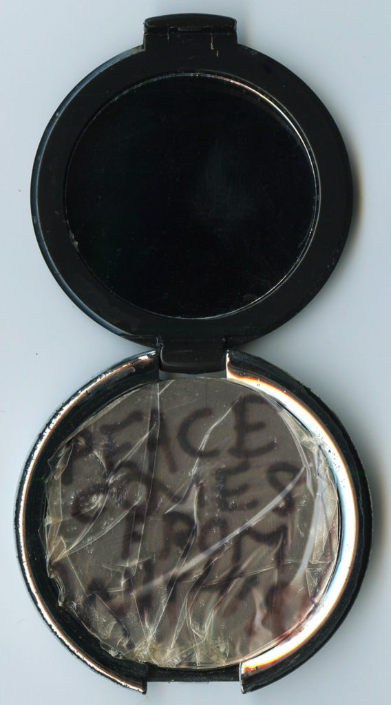 “For this project, I used an image of graffiti to use as the transfer, which says “peace comes from within.” I wanted to transfer this image to a little pocket mirror, so that anytime someone goes to look at themselves with the mirror they would see this phrase instead. I wanted it to be a reminder that your value or self-worth shouldn’t come from your appearance, so you shouldn’t have to be constantly checking yourself in the mirror. The graffiti on the transfer is reminiscent of lipstick writing on a mirror, and I created little folds in the transfer to appear as if the mirror itself is cracked and broken.”