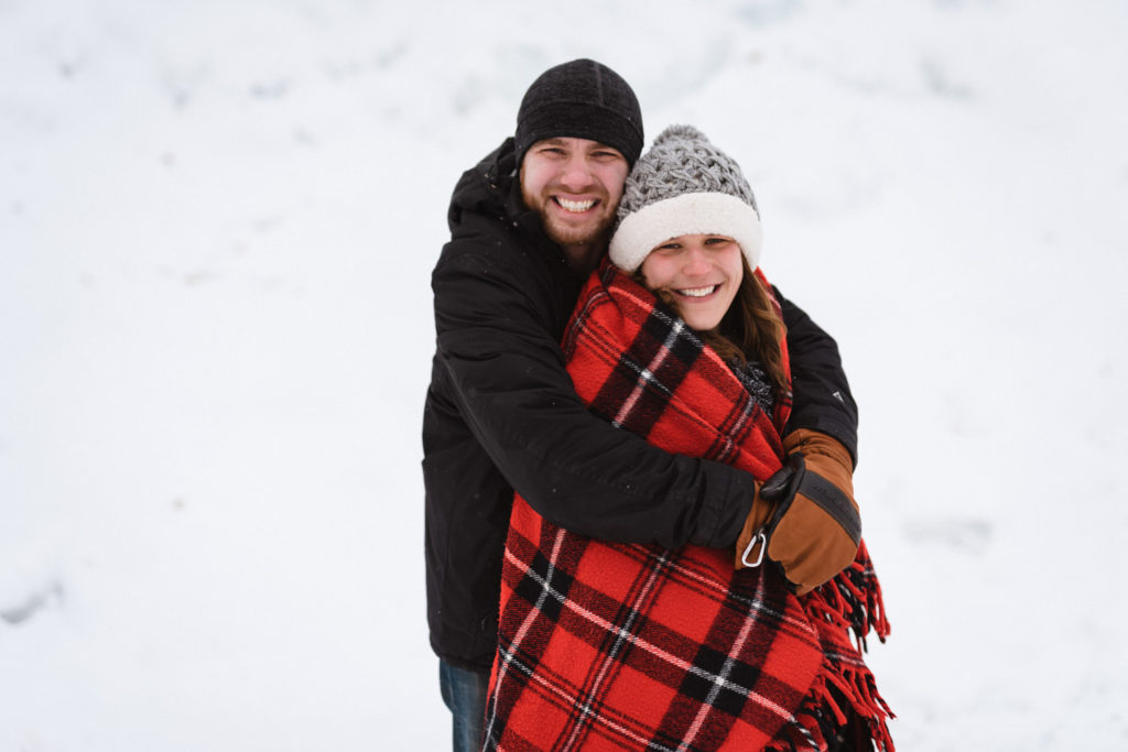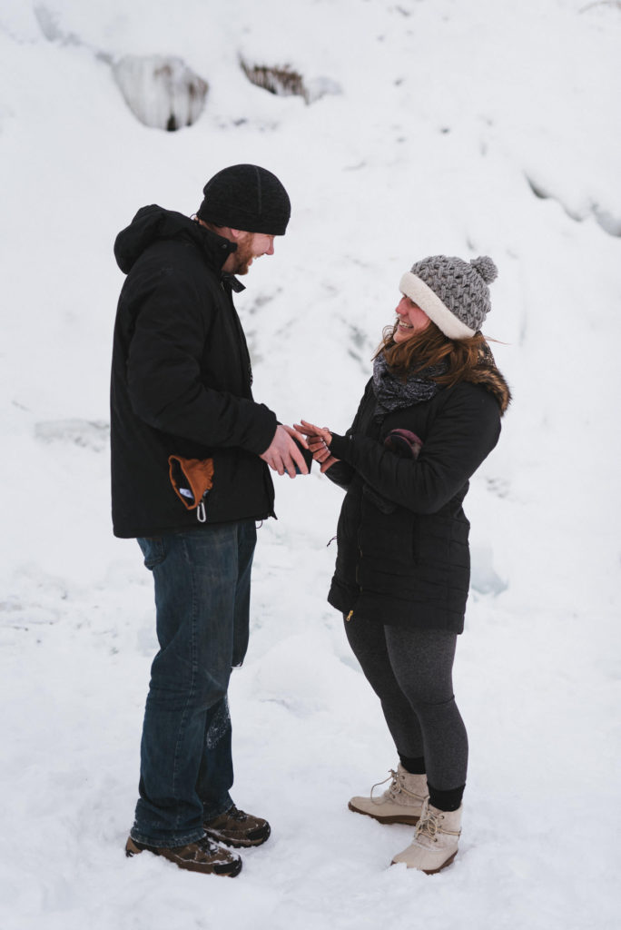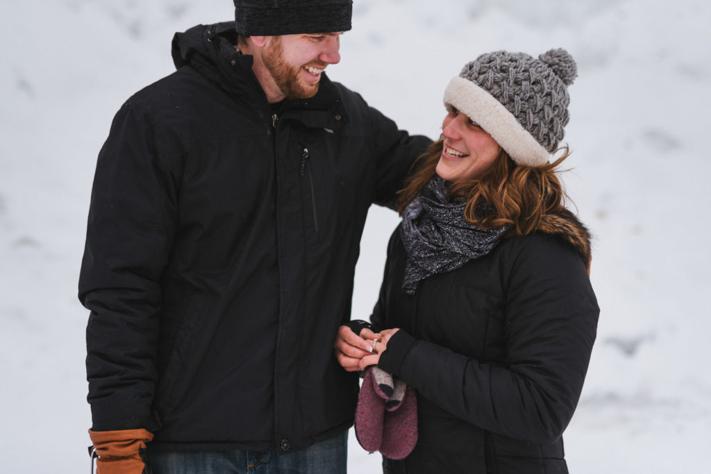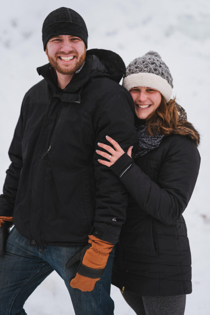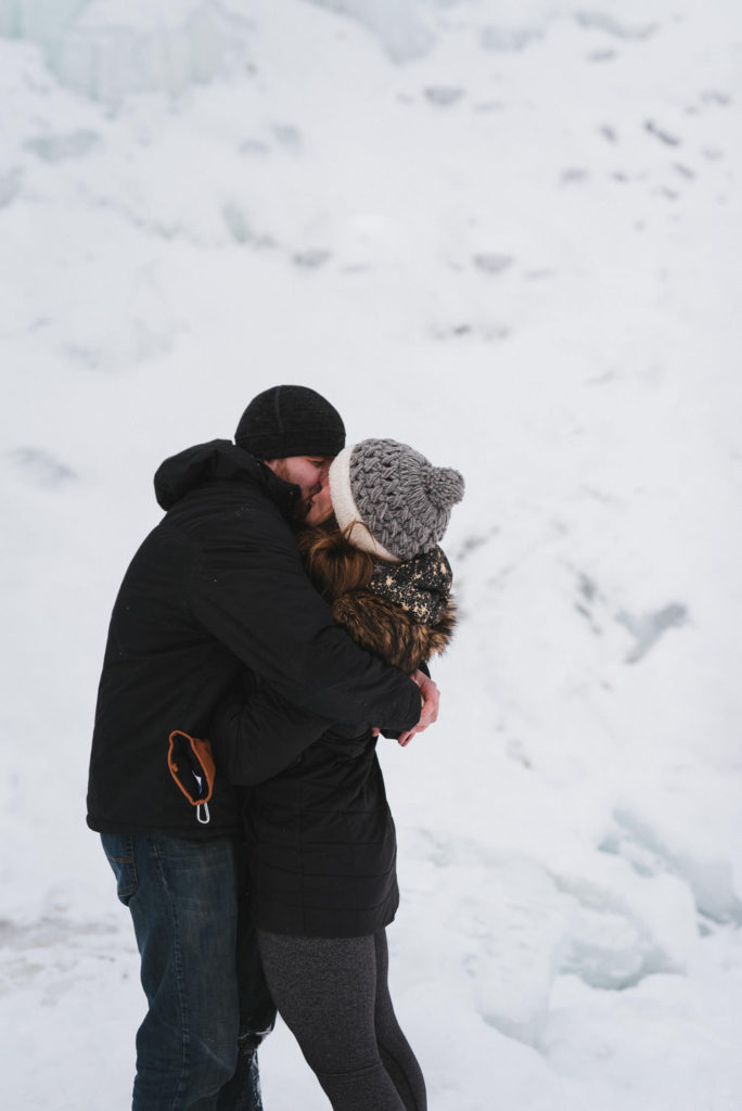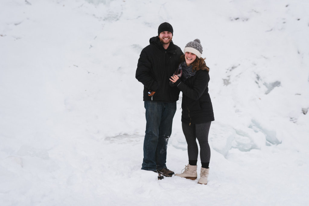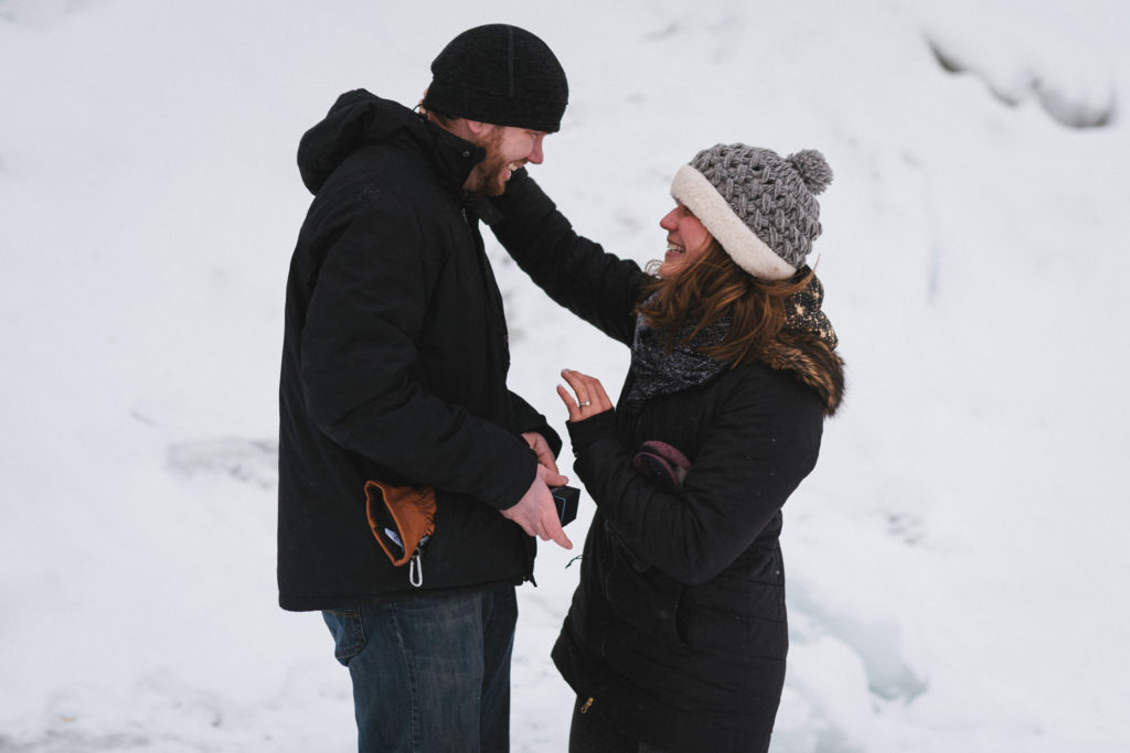 My longtime friend Jordan gave me a call early January for some advice on his plan to propose to his love Amanda. There was no way I was going to miss photographing this beautiful moment for the two of them, and I planned my trip to Minneapolis. Towing my best friend Maddy along with me, we met Jordan at Minnehaha falls Monday morning of January 15th to nail down the game plan. Jordan left to go surprise Amanda at her friends house, as she thought Jordan had to work that day. Maddy and I waited down by the waterfall for them to arrive. It was frigid cold outside, we were so bundled up there was no way anyone would be able to recognize us. When Jordan and Amanda arrived, I was pretending to take pictures of Maddy so that Amanda would think nothing of there being a photographer there. Jordan got to his predetermined spot, and I quickly turned my lens their way, and the incredible moment shown below happened. Jordan couldn’t have picked a more magical spot for such a special time in their lives. I was so honored to be able to capture this for them! Also, read more about their proposal over at How He Asked!
