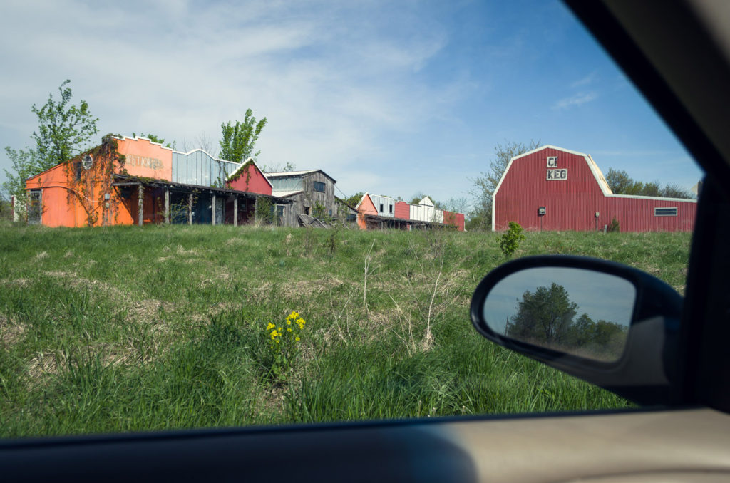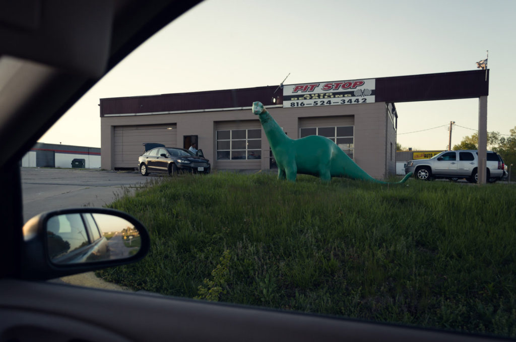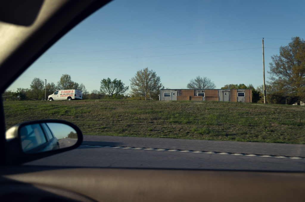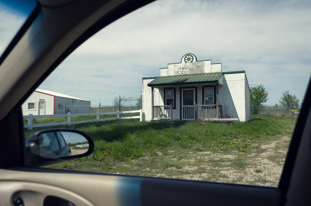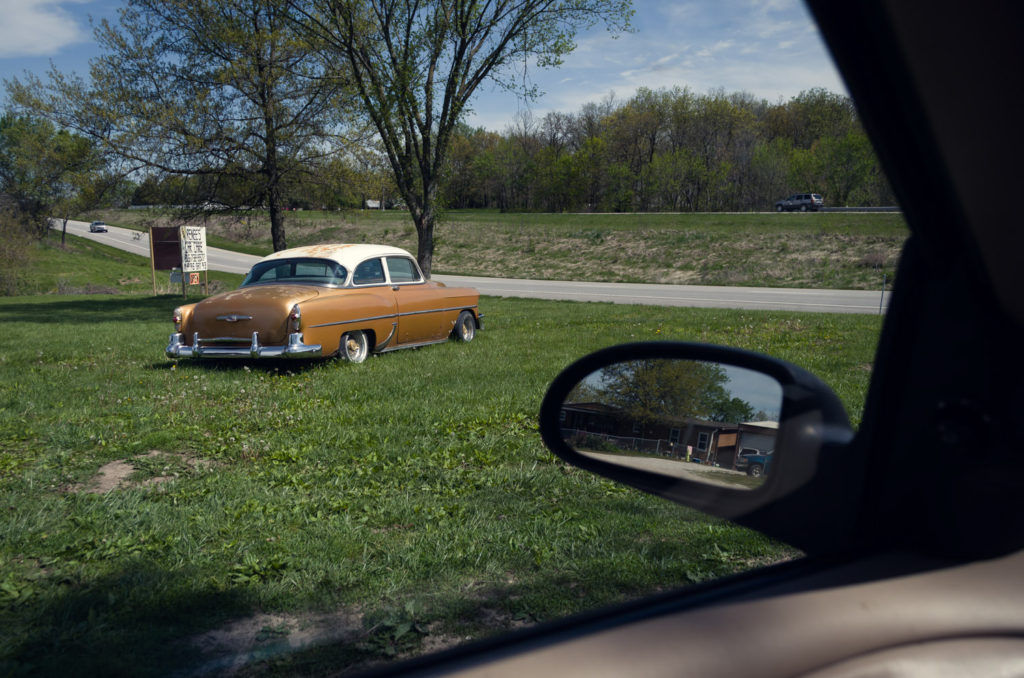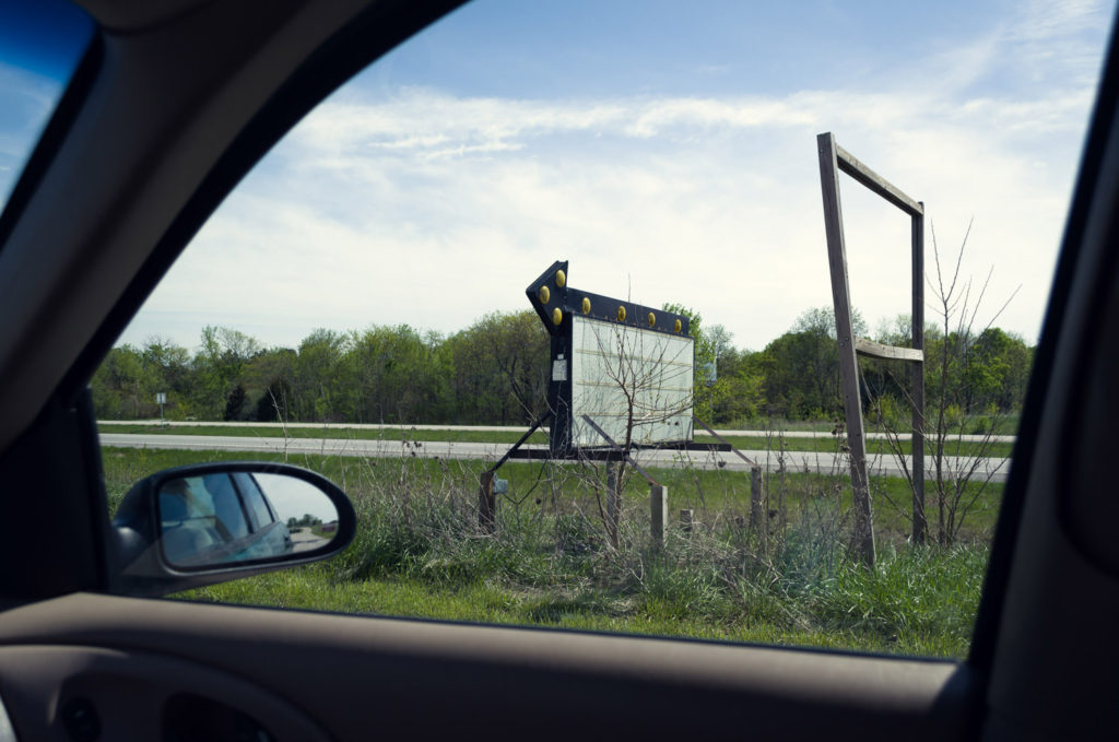 Our last project in our Contemporary Landscape class was completely open, so we could choose whatever we wanted to do. After spending so much time in the car during our road trip to California, and all of the traveling I do to and from school and home or driving around in general, I decided that I wanted to shoot the landscape from inside my car. People spend so much time traveling in cars and it’s through the windows of a car that we see a lot of the landscape. There is always that separation between you and the rest of the world, and I wanted to use that as a way to frame my project. I discovered that Lee Friedlander did a project like this called America By Car, and I used his project to help inspire me. I was struggling to figure out what I wanted to shoot exactly, so to give myself some guidelines I chose to shoot all of the weird stuff I could find along the road on Highway 50 between Warrensburg and Lee’s Summit. I drive this road all the time, and I never really noticed these things until I was looking for them. I hoped to create a sense of nostalgia by photographing the remnants of an older time that may have been forgotten but still remain in the landscape.