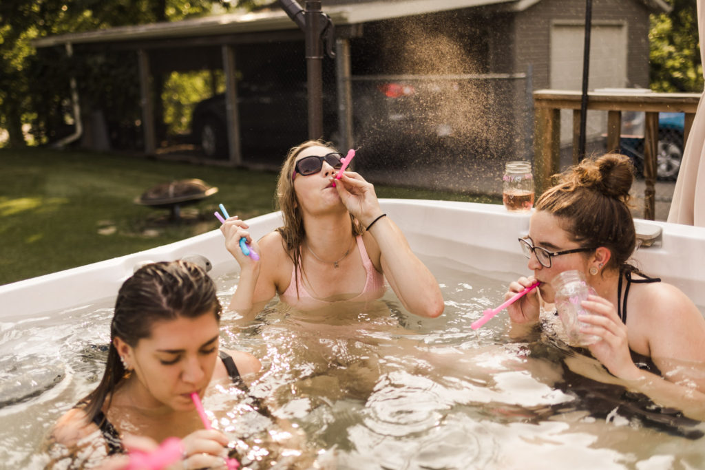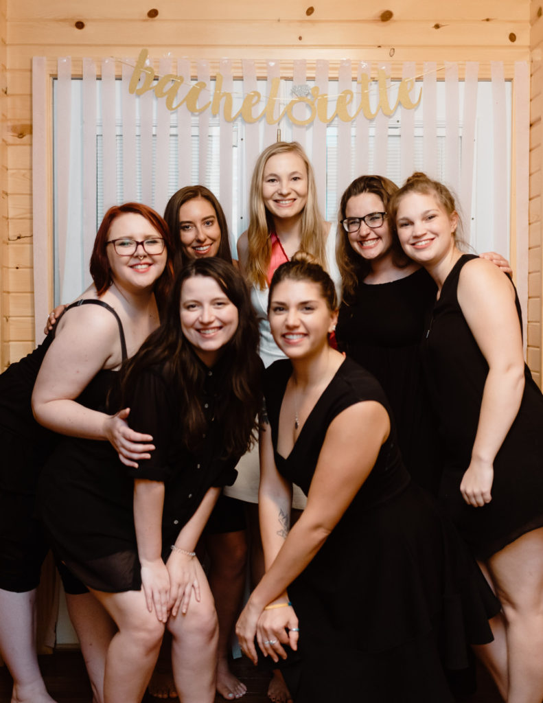 One of my best friends from high school, Emily, is getting married in November! Woo! Plus, I get to photograph the wedding! Shedding all the tears over here. We celebrated her bachelorette party at her parents cabin home on a lake in Minnesota. We got our high school girl squad together, which doesn’t happen often, and had a blast all Saturday. Our day started with mimosas (duh!) in the morning, and it just got better from there. The weather was perfect, so we spent a good chunk of the day outside in the pool and the hot tub. Emily had the perfect diamond ring floaty for herself, and our friend Hannah brought a beer pong floaty!