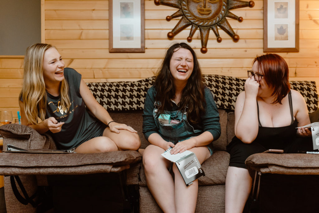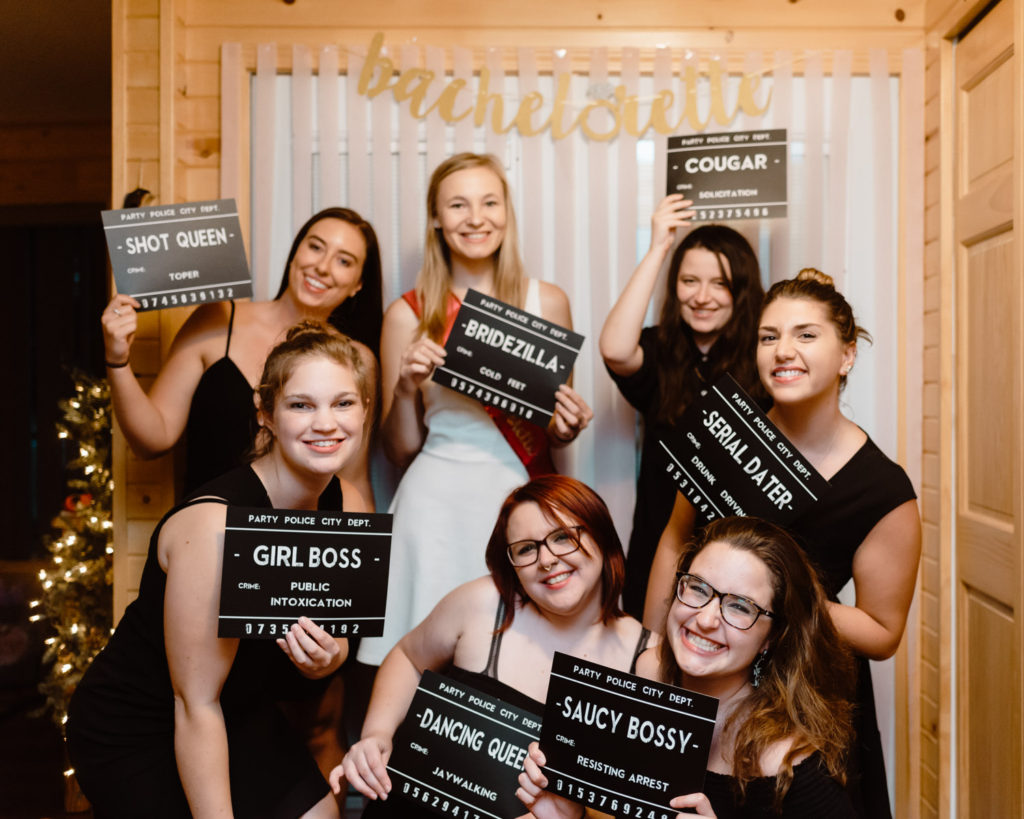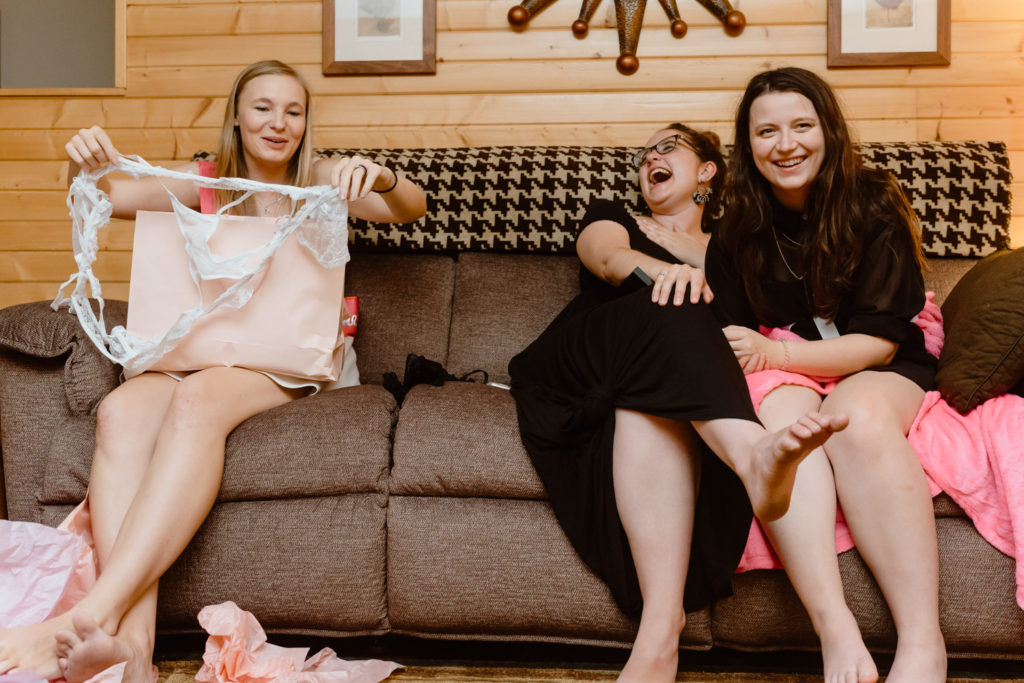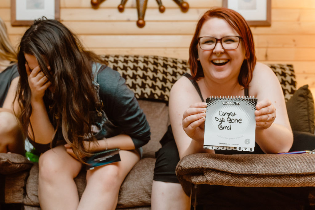 Later in the afternoon after lunch, where we perused old high school yearbooks, we were all pretty toasted and may have had a little bit too much fun hanging out in the hot tub. (Cue all the silly shenanigans with the penis straws…) Once it got dark we headed back inside for some more obligatory bachelorette party photos before dinner. The fun continued after dinner with Emily opening her gifts, and then we played Telestrations, which is always a blast when everyone’s had a few drinks!