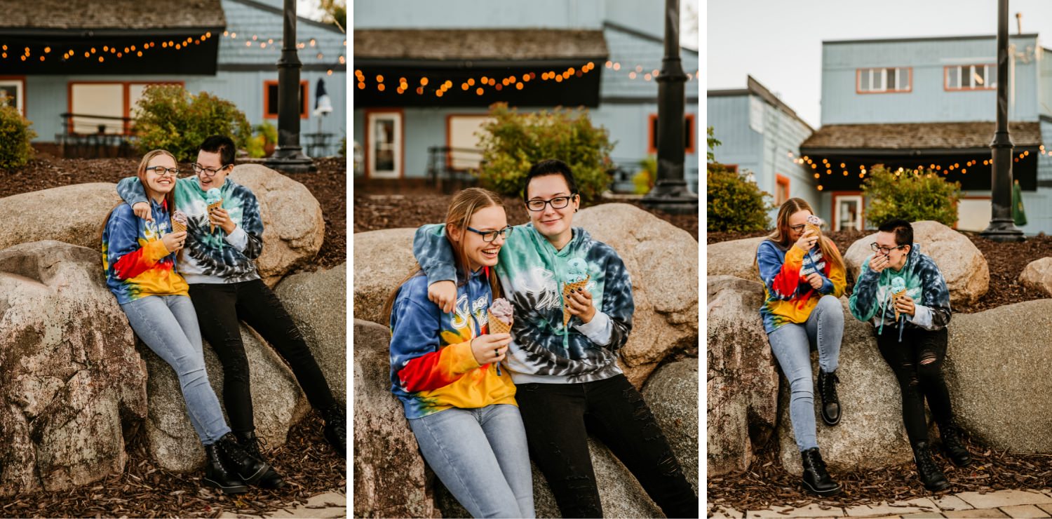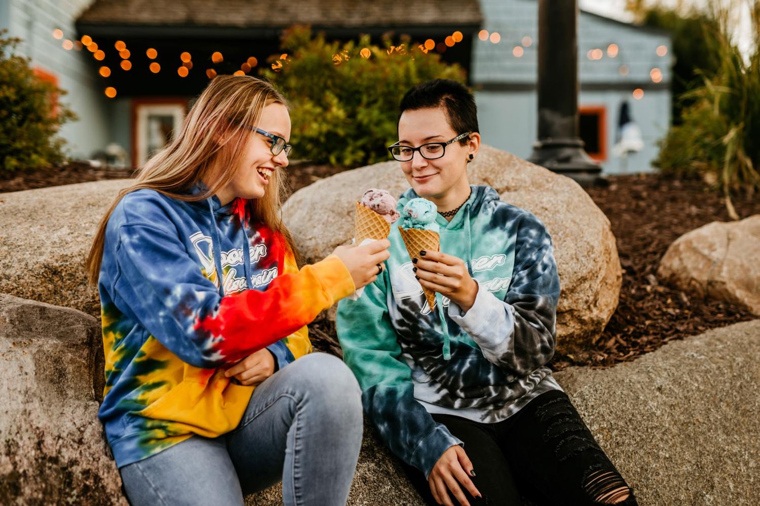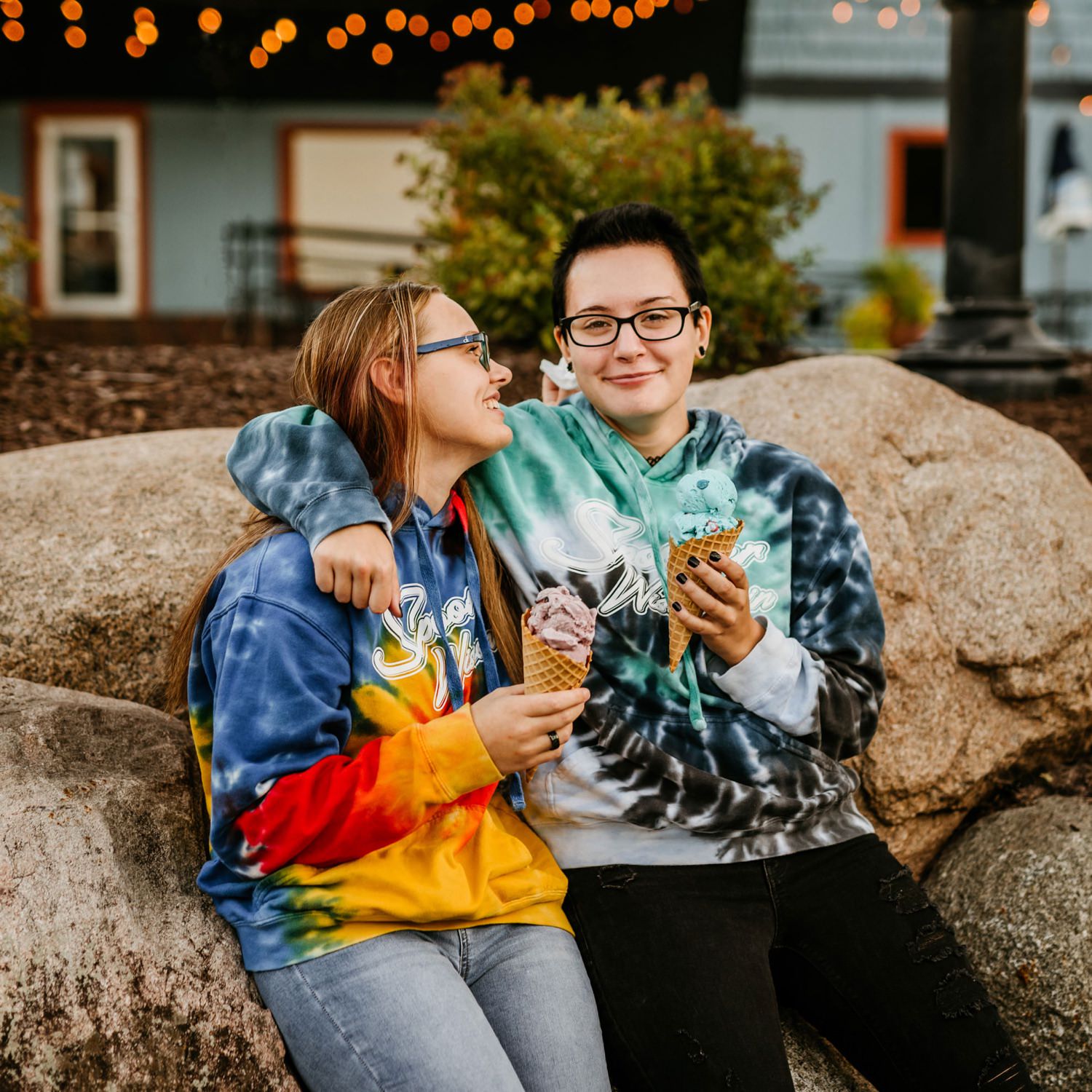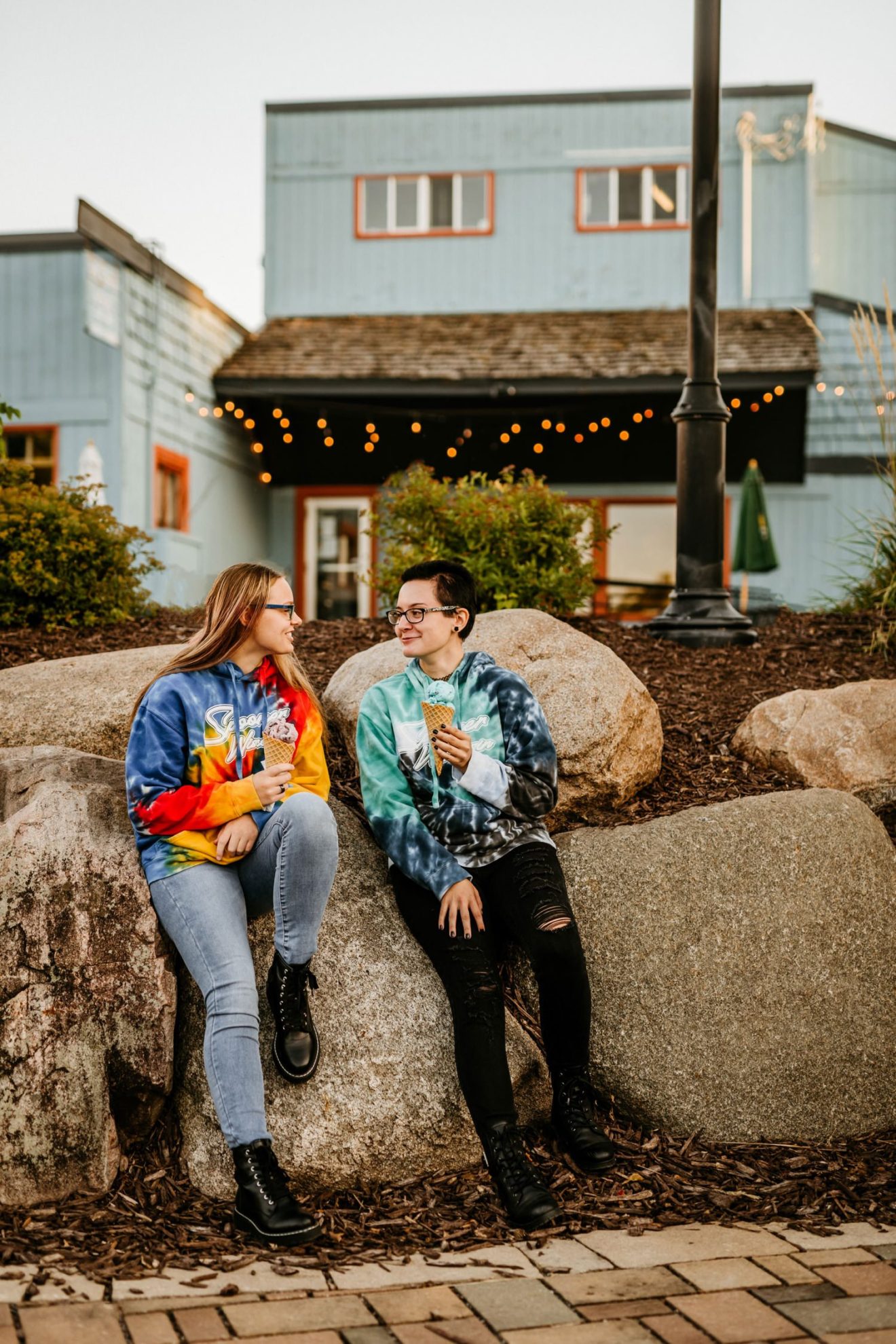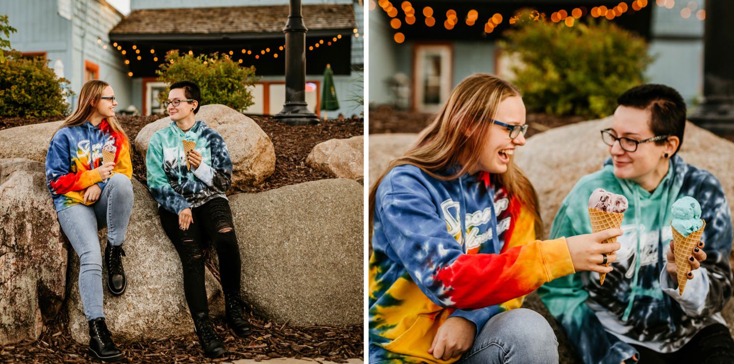 To wrap up the session we headed back to downtown Victoria and grabbed some ice cream from The Social Ice Cream Parlor. 10/10 would recommend! I planned it out so we would be there right around dusk, so I knew the twinkle lights of the nearby restaurants would be turned on. The girls also surprised me with a third outfit change; tie-dye sweatshirts that also matched their ice cream flavor choices perfectly! You can’t go wrong with ice cream, best friends, tie-dye, and twinkle lights.